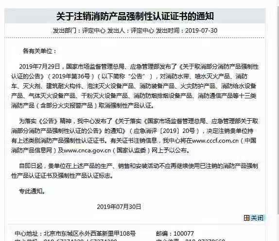 2019年7月29日,国家市场监督管理总局、应急管理部发布了《关于取消部分消防产品强制性认证的公告》(2019年第36号)对消防防烟排烟设备产品、消防通信产品等十三类消防产品,取消强制性产品认证。 获证企业将原有 强制认证证书 转换为 自愿认证证书 ,我司已全部将证书转换完成,自2019年8月1日起,我司所有消防排烟产品将不在张贴强制3C认证标志,随货资料将不在提供强制认证证书,更换为自愿认证证书,望各采购使用单位周知。